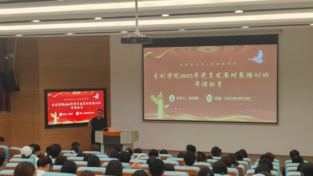 为深入学习贯彻习近平新时代中国特色社会主义思想,全面落实新时代党的建设总要求,切实提升党员发展对象的政治素养与理论水平,吉利学院2025年党员发展对象培训班于9月10日18:30在明德楼170隆重开班,由商学院党总支副书记徐绍埔同志作开课动员,经各二级学院严格推选的80余名党员发展对象集体参加。