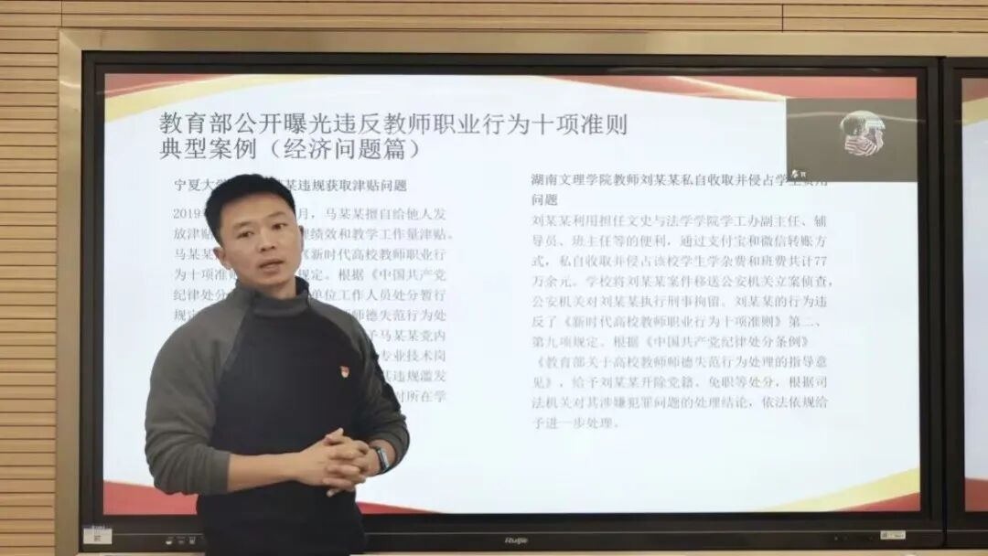 随后,党支部书记文海钧同志以“廉政警示教育”为主题,为全体同志作专题授课。文书记围绕党纪党规的核心要求,结合近年来师德师风专题查处的典型违纪违法案例,深入剖析了腐败问题产生的思想根源与严重危害。他强调,党员同志必须时刻保持清醒头脑,做到“知敬畏、存戒惧、守底线”,在日常学习和工作中严格自律,防微杜渐。