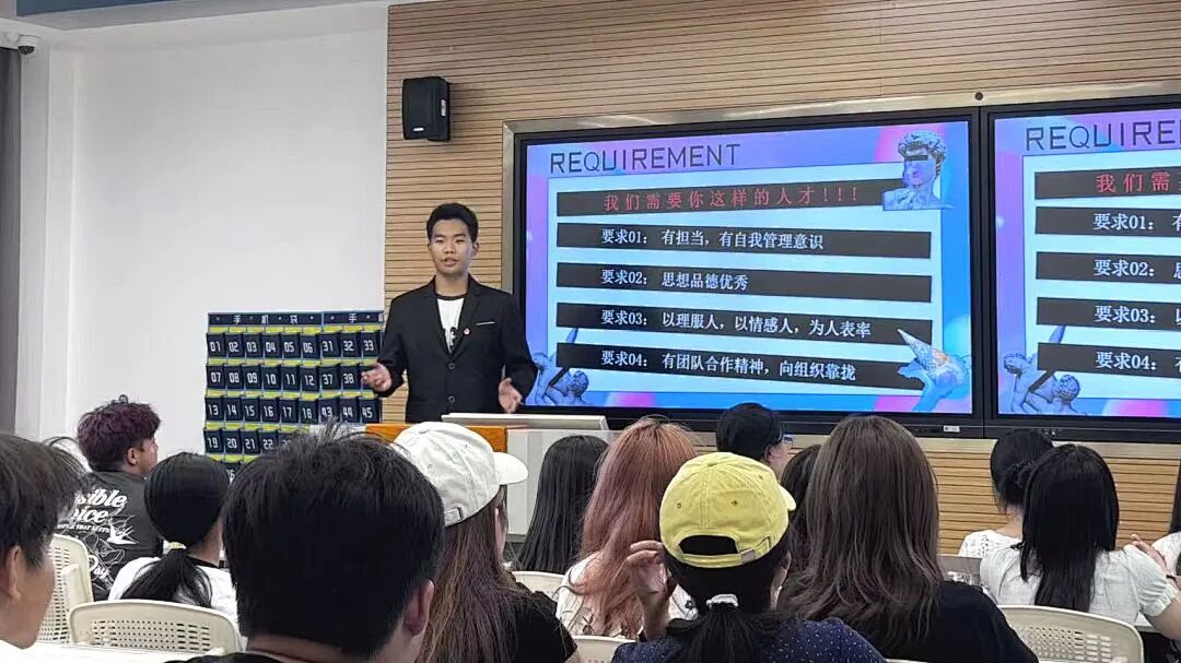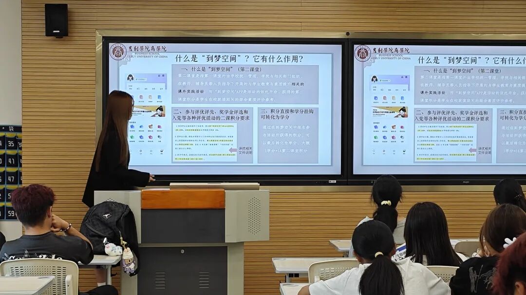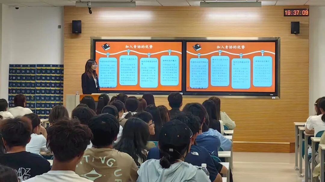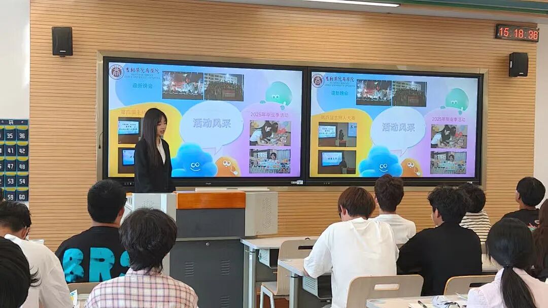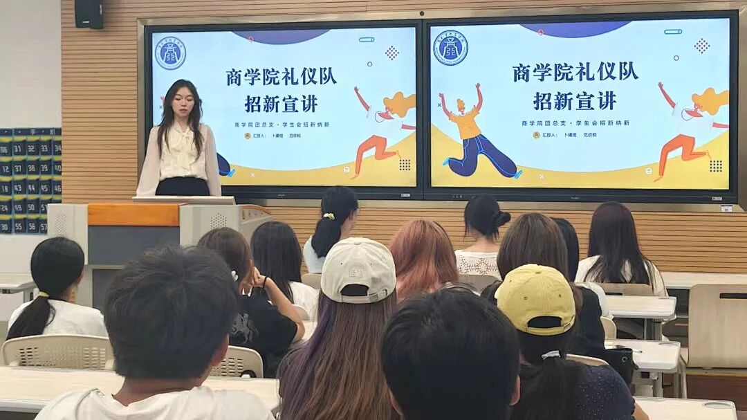 8月30日晚,商学院团总支书记吴涓老师在明德楼170教室面向商学院全体新生开展招新宣讲。宣讲中,吴涓老师详细介绍了商学院团总支·学生会的核心定位、组织体系及整体工作方向,结合过往活动案例与团学发展成果,让新生对团学组织有了宏观且清晰的认知。同时,吴涓老师分享了对新生参与团学工作的期待,鼓励同学们主动把握机会,在实践中锻炼自我、增长才干。