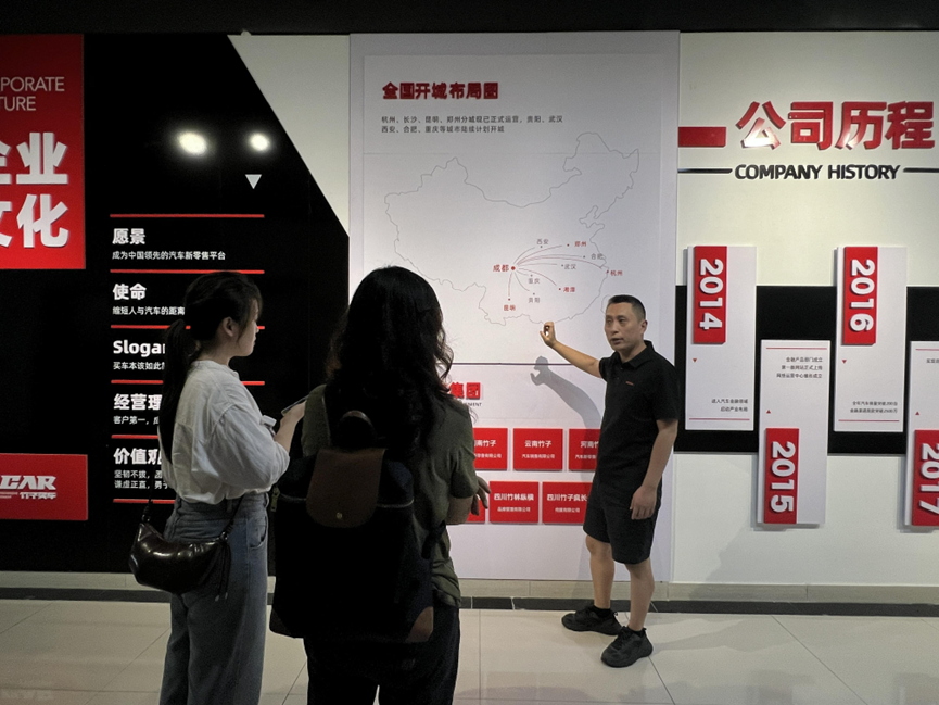 2025年8月7日,我校商学院市场营销教研室古蔚主任带领骨干教师屈婧、汪玲含、赵欢、朱希炜一行,前往位于成都市金牛区ZCAR竹子买车进行调研学习。此次访企活动旨在深入了解汽车新零售行业的前沿动态,探索校企合作新路径,为人才培养方案优化与教学实践创新提供现实依据。