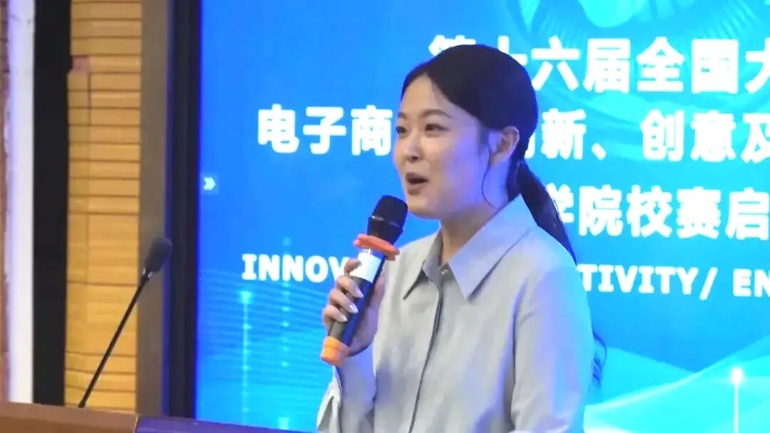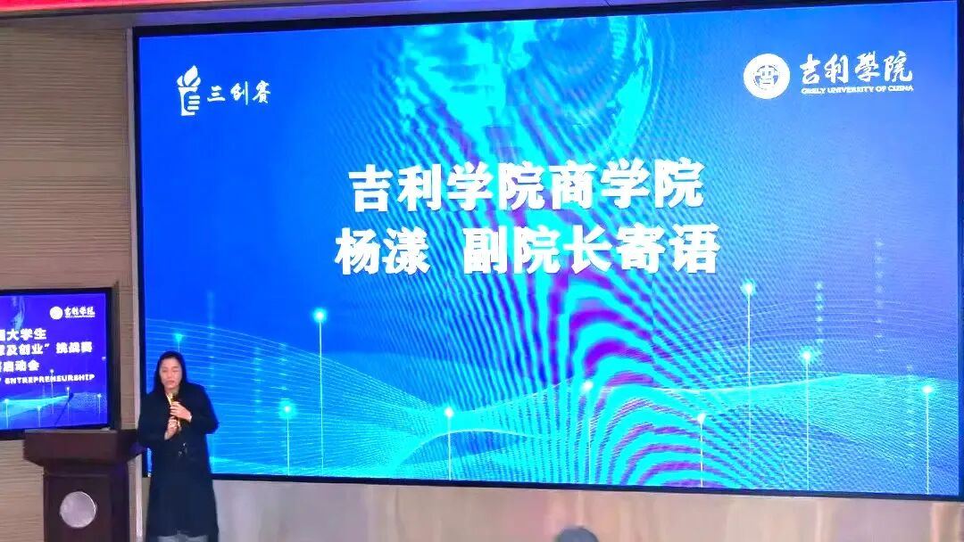 商学院副院长杨漾代表学院发表讲话,着重阐述了三创赛在全国高校赛事矩阵中的重要定位与实践价值,明确强调吉利学院始终秉持 “以赛促教学、以赛促创新、以赛促实践、以赛促育人” 的核心育人宗旨,将赛事实践深度融入人才培养的各个环节。讲话中,杨漾教授还系统回顾并分享了吉利学院在历届三创赛中斩获的丰硕成果。这些亮眼战绩不仅直观彰显了学校创新创业教育的扎实成效,更生动展现了吉利学子不畏艰难、奋勇拼搏、勇于开拓的精神风貌。最后,杨漾教授作为赛事东道主商学院的代表作出郑重表态,学院将切实扛起主体责任,以周全细致的服务保障举措为赛事保驾护航,确保各项赛事环节规范有序推进。