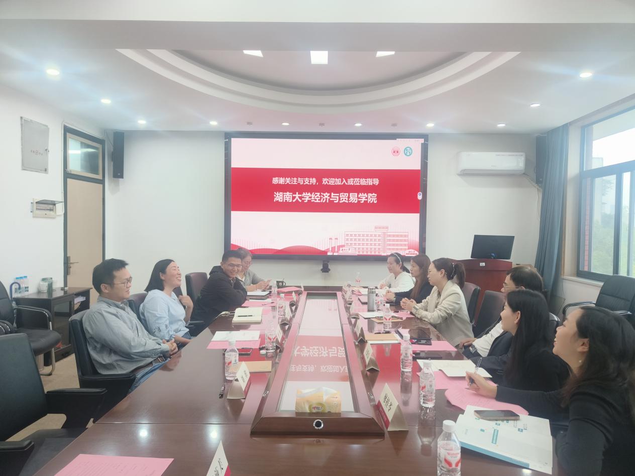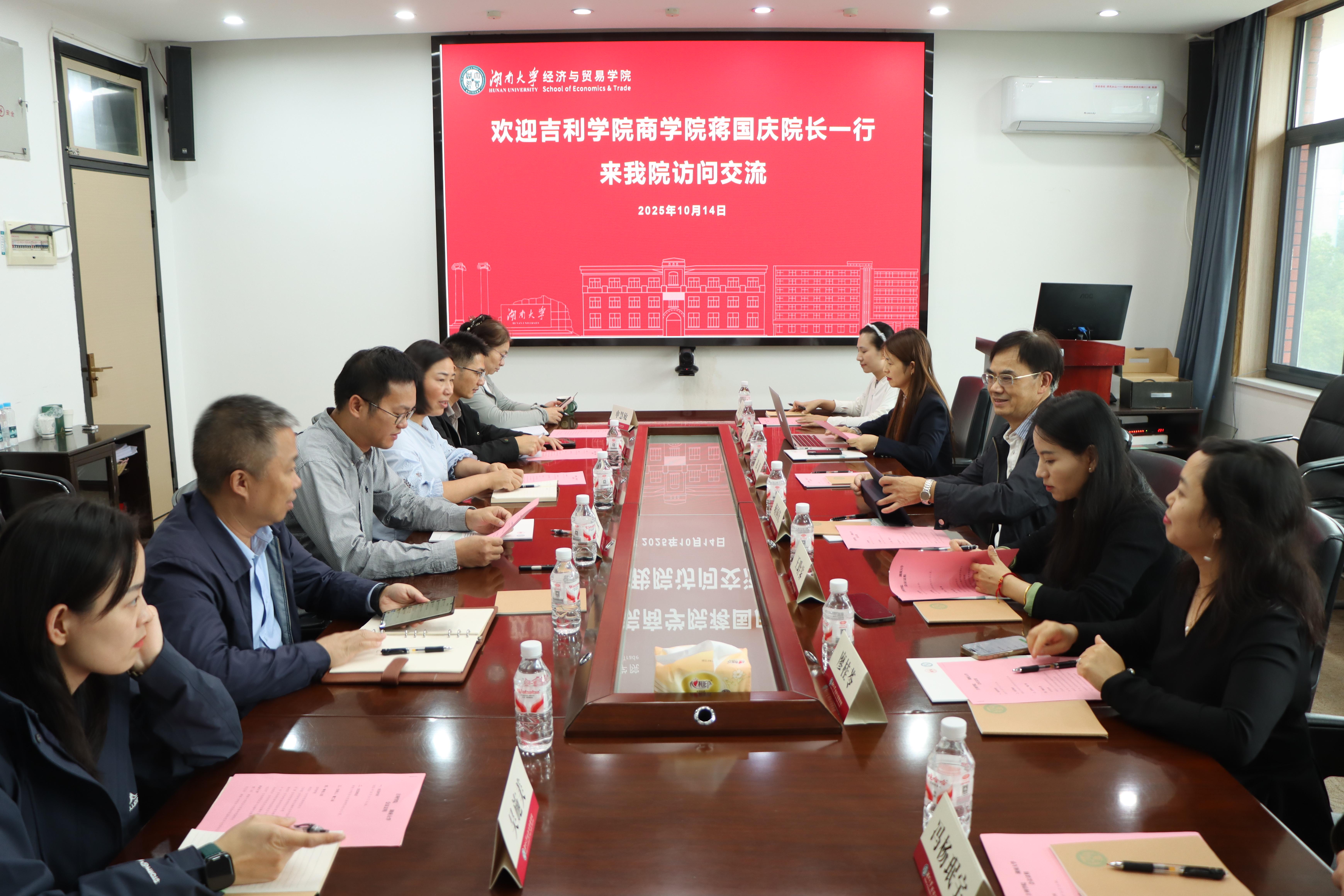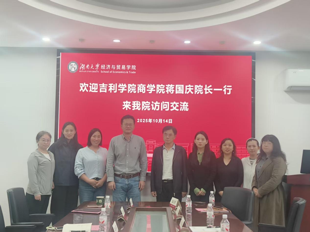为深化校际合作、交流一流专业建设经验、推动新商科背景下国际经济与贸易、金融科技人才培养模式改革,2025年10月14日下午,吉利学院商学院、盛宝金融科技学院联合调研团赴湖南大学经济与贸易学院开展专题调研交流。湖南大学经济与贸易学院副院长曹二保教授、国际经济与贸易系主任邓玉萍教授、国际经济与贸易系党总支书记吴施美教授、数字经济系主任万光羽教授、教学办主任申慧敏、金融与统计学院刘主任,吉利学院商学院院长蒋国庆教授、金融科技学院副院长王聆霁副教授、商学院院长助理赵源老师、国际商务教研室廖桂苓副教授、卢玲老师、盛保金融科技学院冯杨珉宇老师、包冯芹老师等出席了本次学科专业专题研讨座谈会。