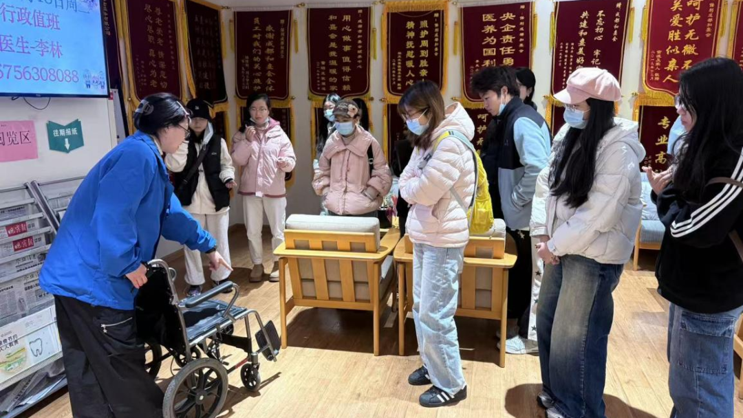 活动伊始,志愿者们首先接受了一场特别的“岗前培训”。在养老院专业护理人员的详细讲解和示范下,同学们认真学习了轮椅的正确使用方法:如何平稳地展开与收起、如何协助老人安全坐稳、推行过程中如何避开障碍物、上下坡时如何保持平衡……每一个细节都关乎老人的安全与舒适。志愿者们轮流上手操作,从最初的生涩到逐渐熟练,他们深知,这不仅仅是一项技能的学习,更是一份沉甸甸的责任。这份严谨与专业,是青商学子将管理思维中的“流程”与“细节”应用于公益实践的生动体现,只为给长者带来最安心、最可靠的陪伴。