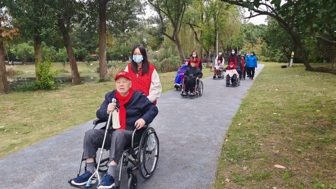 培训结束后,志愿者们小心翼翼地推着坐在轮椅上的老人,走进了养老院的花园。秋日的阳光透过稀疏的枝叶,洒下斑驳的光影,也洒在老人们洋溢着笑容的脸上。志愿者们时而俯身,耐心地倾听老人讲述过去的岁月故事;时而充当“导游”,介绍园中的一草一木。轮椅缓缓前行,碾过落叶,发出沙沙的声响,与大家的欢声笑语交织成一曲温馨的秋日交响曲。对于很多行动不便的老人而言,这不仅仅是一次简单的户外活动,更是一次心灵的放风,一次重新感受外界生机与美好的珍贵机会。