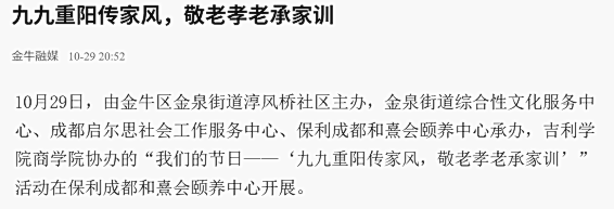 10月29日,由金牛区金泉街道淳风桥社区主办,金泉街道综合性文化服务中心、成都启尔思社会工作服务中心、保利成都和熹会颐养中心承办,吉利学院商学院协办的“我们的节日——九九重阳传家风,敬老孝老承家训”主题活动,在保利成都和熹会颐养中心温情举行。