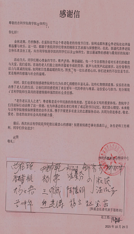 二是收获一份“无价之宝”——数位长者联名签下的感谢信。信纸上面密密麻麻留下了敬老院多位老人亲笔签名,最年长者93岁,最“年轻”的也有71岁。 字里行间,是长者们的慈爱与温暖;镜头之下,是同学们的责任与担当。这份来自社会和长者的双重认可,比任何奖杯都更加珍贵。它告诉我们,教育的真谛不仅在课堂,更在于培养一颗懂得爱、愿意付出的心。