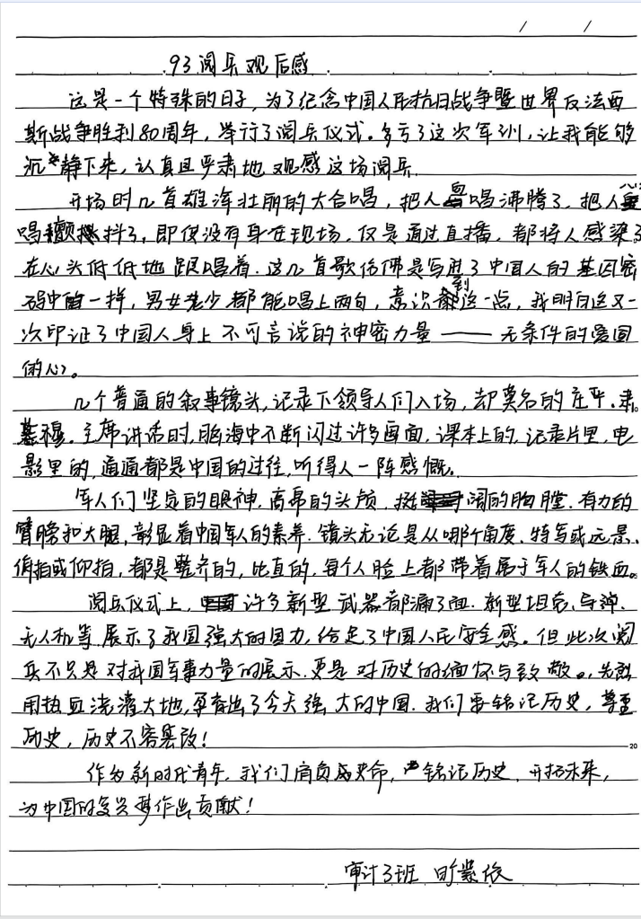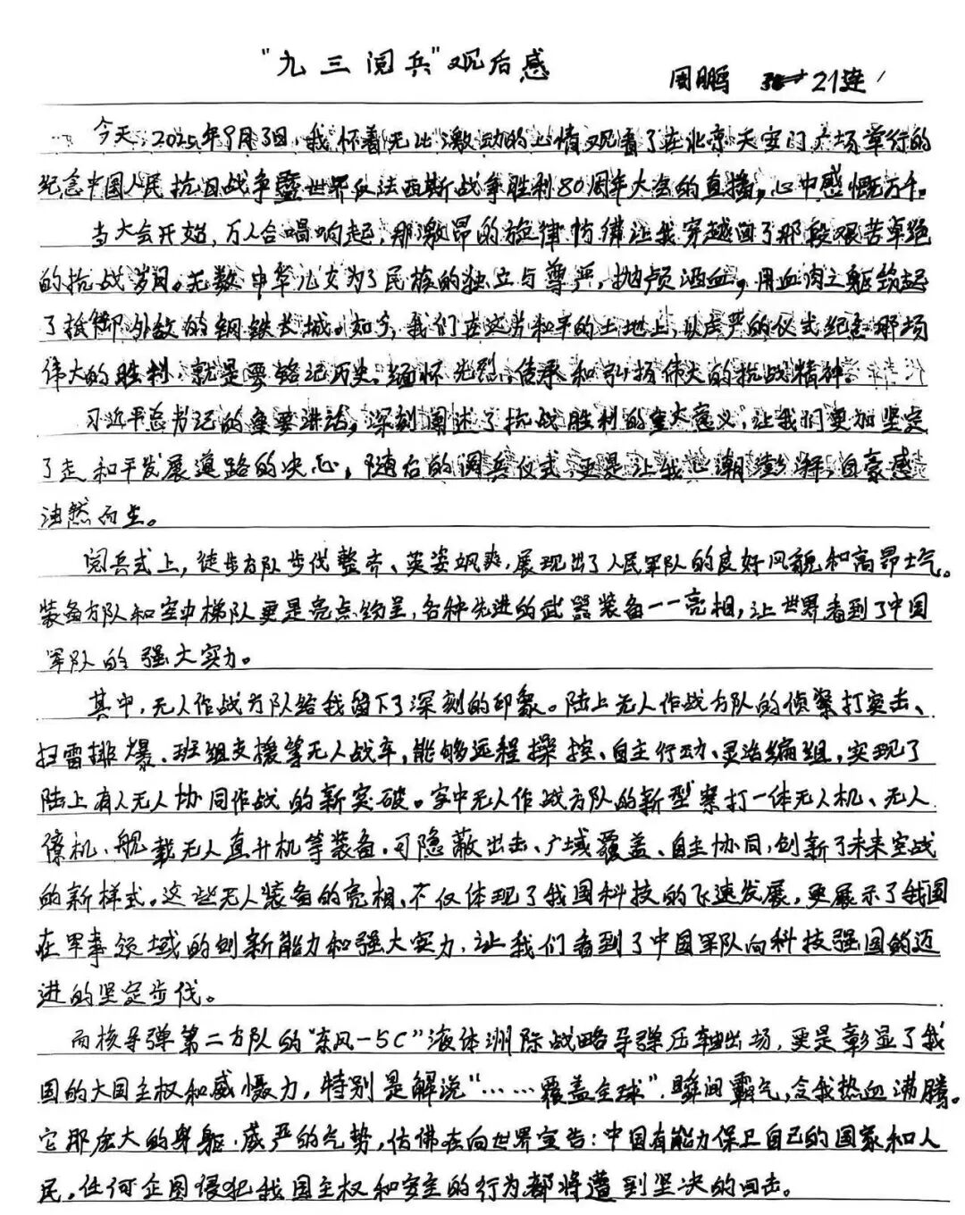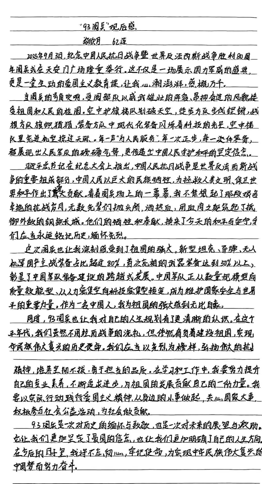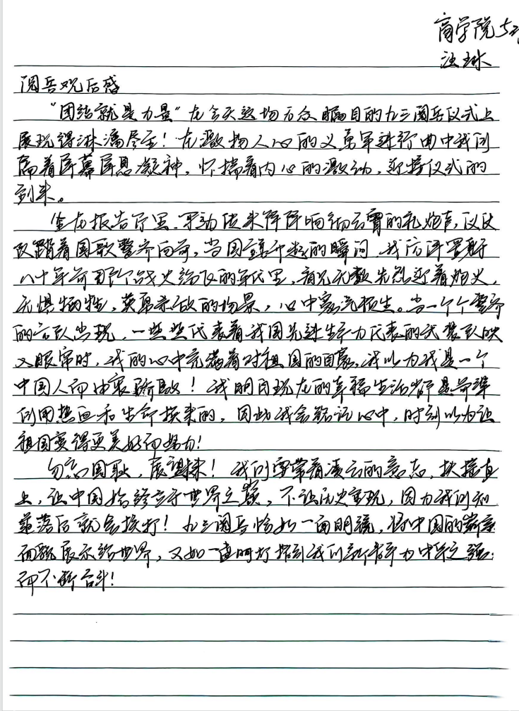 当天上午,同学们早早地来到教室,整齐地坐在大屏幕前,怀着激动的心情等待阅兵仪式的开始。在宿舍里,同学们也纷纷围坐在电脑、手机前,期待着这场盛大庆典的到来。当庄严的国歌响起,全体学生不约而同地起立,齐声高唱国歌,目光坚定地注视着屏幕中的五星红旗。阅兵过程中,受阅部队以严整的军容、铿锵的步伐依次通过天安门广场,展现出新时代中国军人的过硬素质与昂扬风貌;各类先进武器装备有序亮相,彰显着我国日益强大的国防实力与维护国家主权、安全、发展利益的坚定决心。空中方队呼啸而过,后续战机编队在空中拉出绚丽彩烟,震撼的场面让现场师生由衷赞叹,自豪感油然而生。
