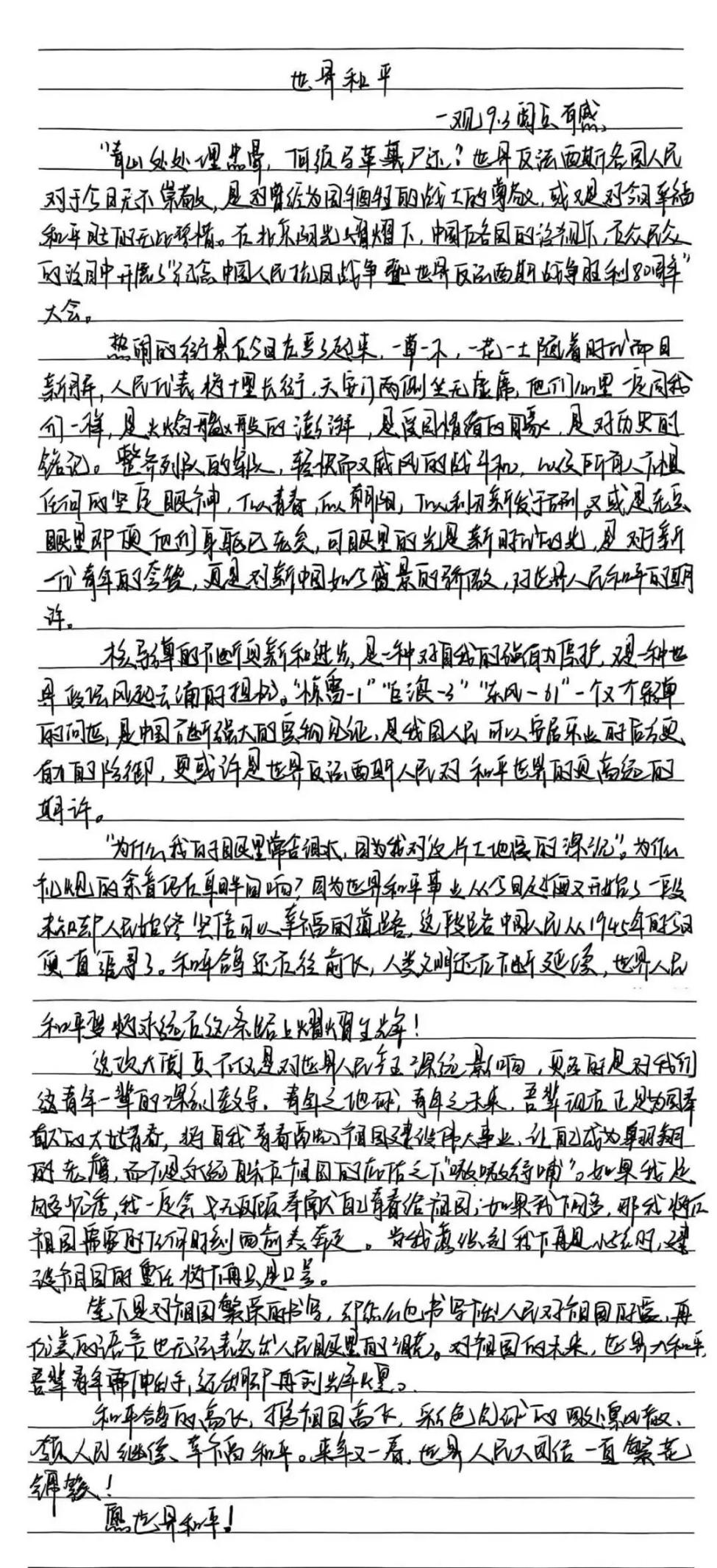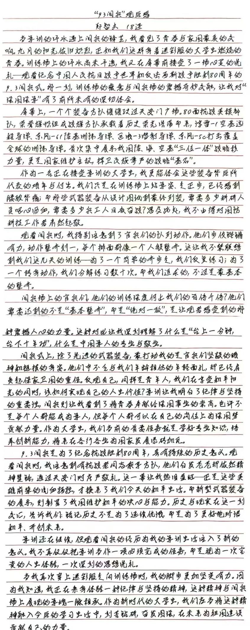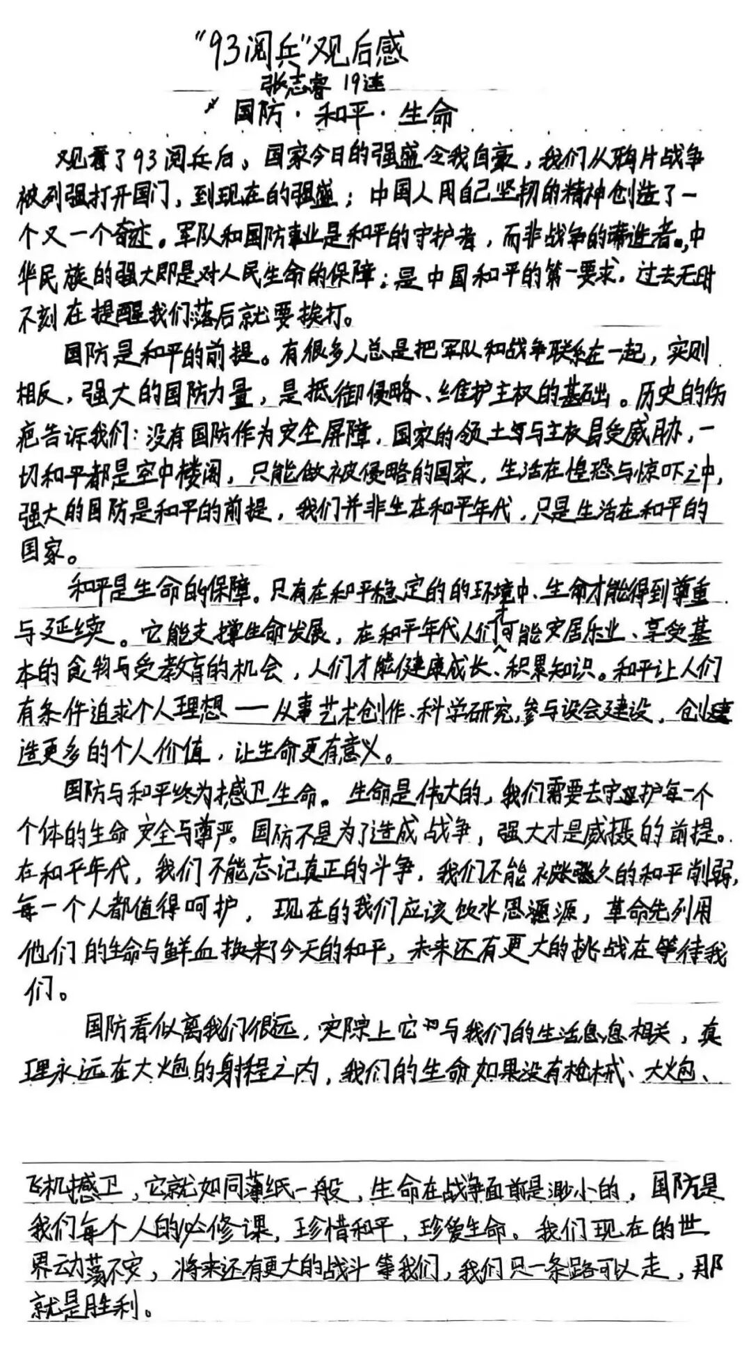 当天上午,同学们早早地来到教室,整齐地坐在大屏幕前,怀着激动的心情等待阅兵仪式的开始。在宿舍里,同学们也纷纷围坐在电脑、手机前,期待着这场盛大庆典的到来。当庄严的国歌响起,全体学生不约而同地起立,齐声高唱国歌,目光坚定地注视着屏幕中的五星红旗。阅兵过程中,受阅部队以严整的军容、铿锵的步伐依次通过天安门广场,展现出新时代中国军人的过硬素质与昂扬风貌;各类先进武器装备有序亮相,彰显着我国日益强大的国防实力与维护国家主权、安全、发展利益的坚定决心。空中方队呼啸而过,后续战机编队在空中拉出绚丽彩烟,震撼的场面让现场师生由衷赞叹,自豪感油然而生。