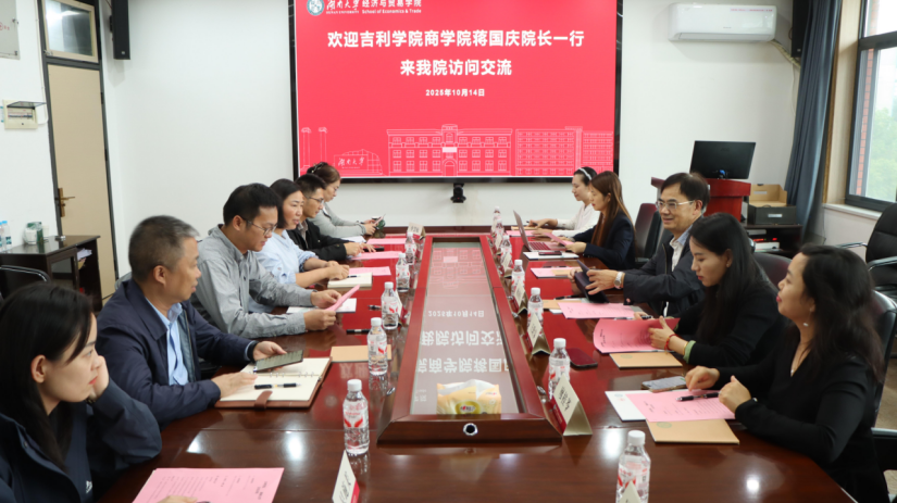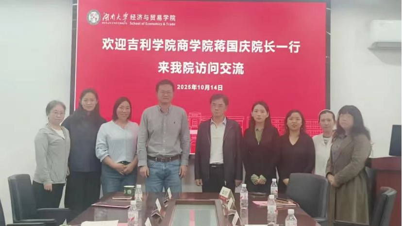 为深化校际合作、交流一流专业建设经验、推动新商科背景下国际经济与贸易、金融科技人才培养模式改革,2025年10月14日下午,吉利学院商学院、盛宝金融科技学院联合调研团赴湖南大学经济与贸易学院开展专题调研交流。湖南大学经济与贸易学院副院长曹二保, 国际经济与贸易系主任邓玉萍、国际经济与贸易系党总支书记吴施美、数字经济系主任万光羽、教学办主任申慧敏、金融与统计学院刘主任,吉利学院商学院院长蒋国庆、金融科技学院副院长王聆霁、商学院院长助理赵源、国际商务教研室教师廖桂苓、卢玲、盛宝金融科技学院教师冯杨珉宇、包冯芹等出席了本次学科专业专题研讨座谈会。
