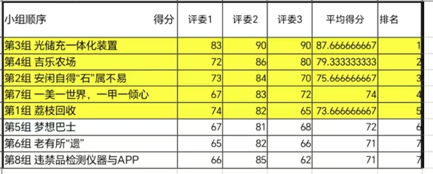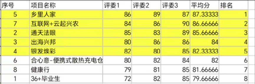 本次大赛评分标准以百分制为单位,根据六位老师的点评,本次“互联网+”创新创业大赛比赛结果如下,同时恭喜前十名脱颖而出的队伍: