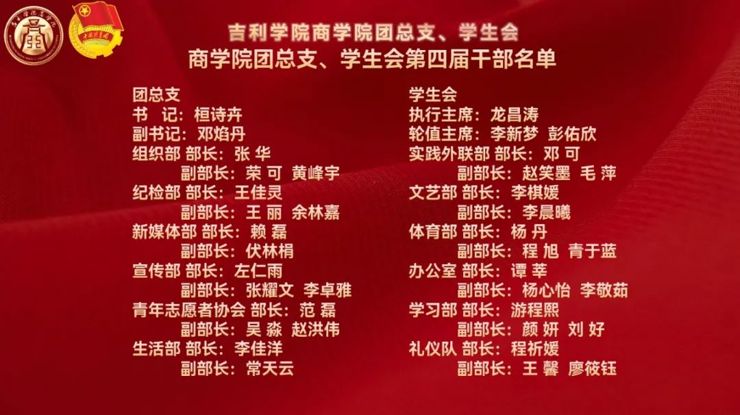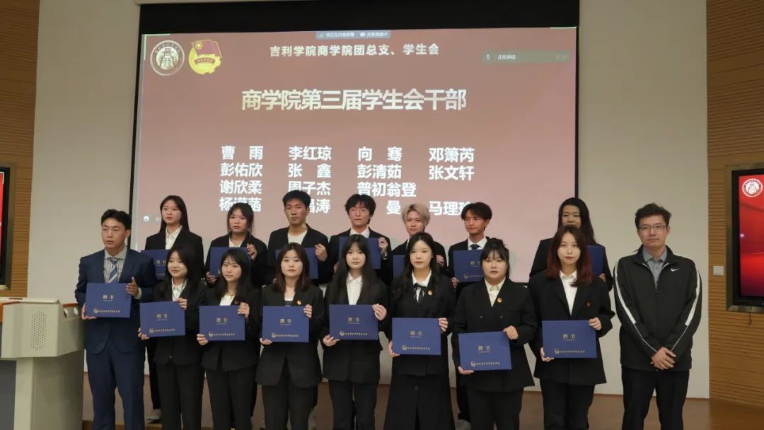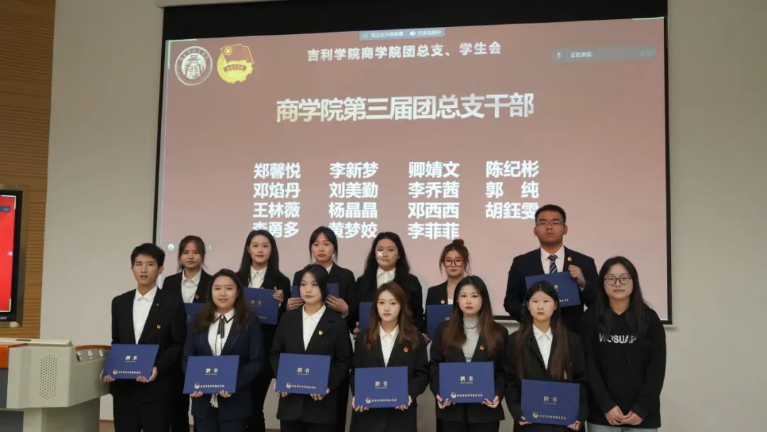 至此,吉利学院商学院第四届团总支、学生会换届大会落下帷幕!通过此次换届大会,商学院将进一步加强新一届团学干部的队伍建设,保障团学工作的连续性,全方位提高团学干部及干事的工作能力,培养每一位成员的服务精神。相信新一届的团总支、学生会能够以更加昂扬的精神状态,在工作中磨砺意志品质,在崭新角色中茁壮成长!