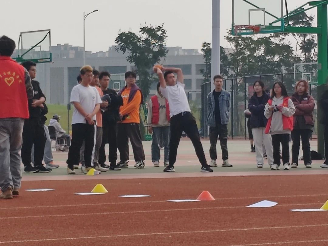 实心球比赛中,只见商学院的选手们手举实心球,用力将其在空中扔出一道优美的弧线,在地上砸出一道道代表他们成绩的痕迹。