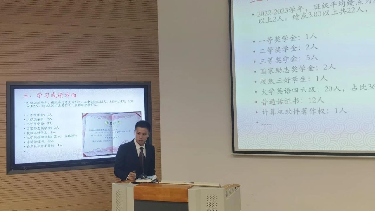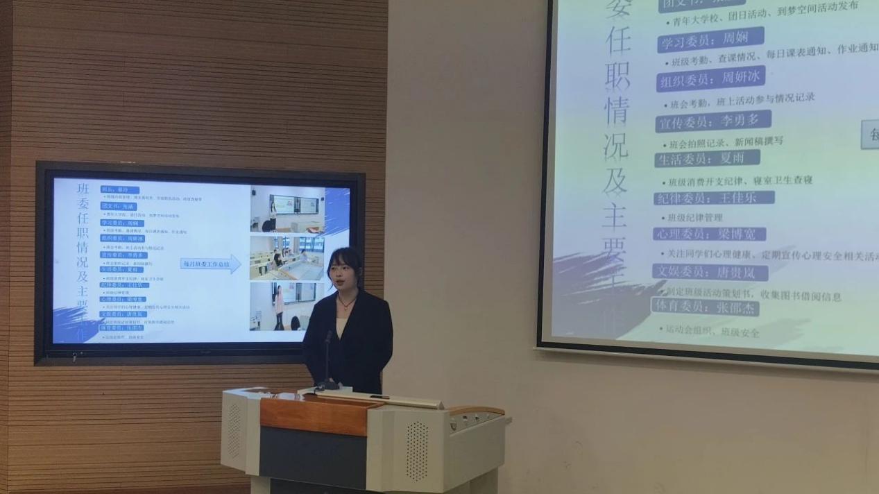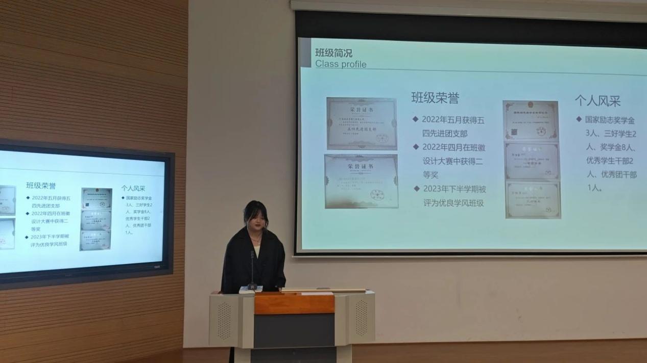 本次邀请综合排名前三的优良学风班级进行展演,各班班长及宣讲人是2021级国际经济与贸易(本科)2班的蔡玲同学、2021级物流管理(本科)1班的潘小蝶同学以及2022级人力资源管理(本科)1班的黄景楠同学,并通过PPT的形式向各位商学院师生展示本班特色风采风貌。
